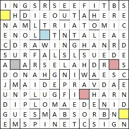 In the absence of any hint or pointer to the theme I had a look around the grid and fortunately did not have to wait long for DESCENDING to appear (almost), and on the opposite side ASCENDING. I duly filled in the yellow squares. BELVEDERE soon followed, but WATERFALL and DRAWING HANDS took rather longer. I first looked for ESCHER in a region such as that ‘framed’ by HARN and HERS, but ESC and HER turned up in that corner ‘framed’ by AESC and HERS (respectively).