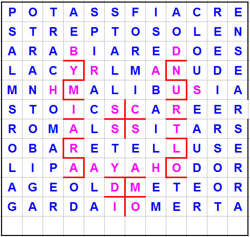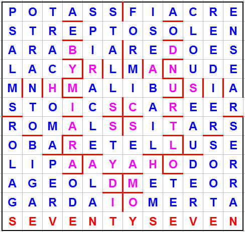 I must admit to having done a bit of experimentation with possible endings for the new down words before hitting on 25+52=77 and was attracted for a time by SEPARATENESS or SEVENTY-EIGHT as possible words acoss the bottom. When SEVENTY-SEVEN eventually dawned on me, it therefore came as a strong candidate for the right answer.