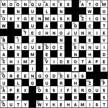 | 19 | VIDEOTAPE | Record time held by half of 8 and most of 24 (9) Def: Record. Wordplay: T[ime] between VIDEO (ref 8D) and APE (most of 24A). |