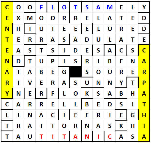 I should mention that Ho had solved a very similarly themed puzzle from the Crossword Club magazine (by Curmudgeon?) involving both flotsam and Titanic. Did anyone else have this experience?