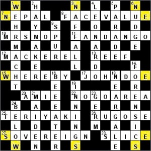 | 13 | REEF | Gather up a chain of rocks (4) Double Def. “Gather up” as in Reefing sails, and “a chain of rocks” as in what you might run your boat into. I had trouble with this one as I thought the def. was just “rocks” and couldn’t understand what the rest of the clue was getting at |