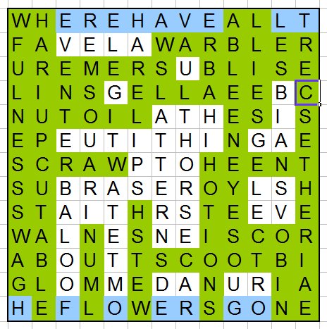 The first across clue gave a hidden FAVELA, so I was off to a flying start! Soon the top line read ??E?EH?V. . . This looked like THERE or WHERE for the first word, so I tried 1D and a simple anagram led to WASTERFULNESS. So WHERE H?V. . . then. After finding EMBALMERS at 13A, PEANUT OIL at 19A and a few others, it became clear that we had to remove plants from the 23 green squared answers. So ASTER, BALM and PEA came out of the three examples above.