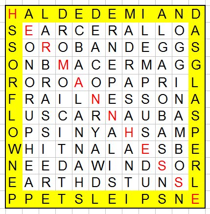 Solving the clues was not as hard as I expected, as there seemed to be little choice about the letters to be removed in many clues, and after steady progress I found the following letters from the across clues. NA?ZISSUNDG??D????. Now this did not seem to be very likely as an English item, and even in German (with the obvious UND) I was unable to guess where it came from. However I did seem to recall that the German version of Narcissus was Narziss, so I thought it was worth a Google. Lo and behold I found NARZISS UND GOLDMUND, a novel by Hermann Hesse. The down clues had yielded ?ETER CAMEN????, so I googled Peter cam… and was rewarded with PETER CAMENZIND, another Hesse novel. So, never having read any Hesse, I found his bibliography in Wikipedia and rapidly filled in the other four items in the perimeter with ROSSHALDE, DEMIAN, DAS GLASPERLENSPIEL and STEPPENWOLF. (I had at least heard of the last one!)