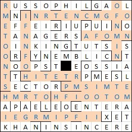 A fair number of other clues suggested that they would produce answers to be encrypted (likely proper names), whilst a number of entries around the grid looked to be in code: OF_MI_ entered at 9d looked to be heading nowhere, and the same for IEG__IP_II at 41a. I tried to decrypt some of these but soon realised that a number of letters would be encrypted to the same substitute. My breakthrough came with solving 41a as RUTHERFORD and realising that he & SHACKLETON were both named ERNEST, the “something in common” being immediately confirmed by solving 1d as HEMINGWAY. The 26-letter phrase was now apparent: THE IMPORTANCE OF BEING ERNEST.