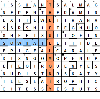 I searched the grid for the ninth item which is “unaffected” and found SO WHAT at 20A (to be highlighted) which has its HAT still ON!