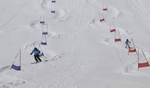 Answer:  A winding course for downhill ski races.  The meaning has been extended to an obstacle course in other sports activities.