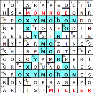 A fairly straightforward solve this week, with the alternatives of TYRE and TIRE at 15dn causing the only perplexity. It was only when I was tackling the bottom left corner that I noticed the preponderence of Xs and Ys in the grid, and guessed that they would be crucial. Indeed, with the corrections to misprints finally showing Egghead weds…, my ODQ revealed a headline, completed by the word hourglass, attributed to Variety in 1956 on the marriage of Marylin MONROE to Arthur MILLER, the two unclued entries.