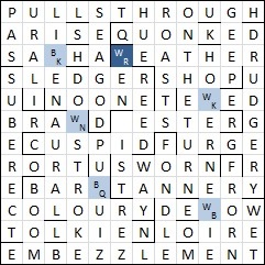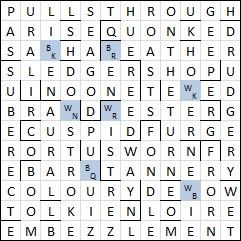 Inq_1292-00 Progress was v-e-r-y slow: I managed FRORN, BOOM, & REZ as down answers in the lower half, which led to EMBEZZLEMENT across the bottom, followed by PUB Quiz then the intersecting BAR-B-Q as my first answers with doubled-up letters. I chipped away, working from the bottom up, slowly filling in most of the grid, bar the top left quadrant. The answer to 1a eluded me for some time, but when that was solved I made reasonably headway with the rest.
