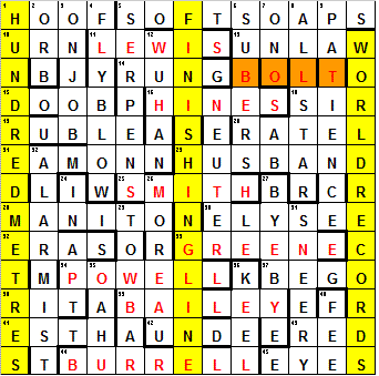 Hihoba: your difficulty to explain the wordplay of a couple of clues is not at all apparent – thanks for the blog. (PS In the grid the font colour of POWELL hasn’t been changed to red.)