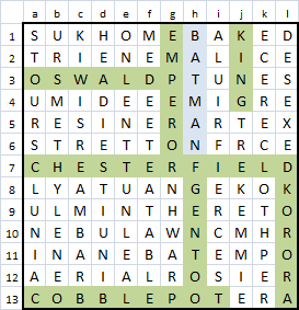 The North-East corner was first to yield and I pretty soon saw what looked like EMPEROR (g1-g7) and KING (j1-j4) forming, which immediately made me think of penguins. South-East was next and I found GENTOO (h8-h13) and KORORA (l8-l13) – which I’d never heard of. 6down, BATMAN, soon became apparent and then I referred to Wikipedia to find out that The Penguin‘s “real” name is OSWALD (a3-f3) CHESTERFIELD (a7-l7) COBBLEPOT (a13-i13). I used to be a real Batman fan in the 60’s but I never got into the movie series and I’m surprised that I never knew The Penguin’s real name as it’s the sort of trivia I would normally have remembered.IQ1295