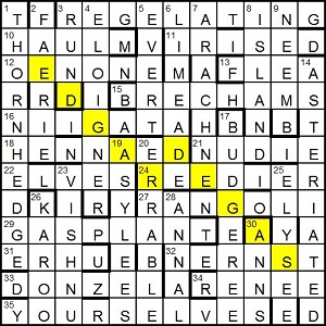 Anyway, the puzzle gradually came together with Kea’s usual high standard of clueing. The choreographic nature of certain answers remained a mystery until I had completed about half of the grid. UNDID at 21ac seemed to become ·UD·E, and switching the first two letters and advancing the last by one resulted in NUDIE. Lo and behold, the only other 5-letter answer I had at that point, 22ac LEVER, became ELVES, and I was home and dry.