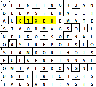 I got the “priest” but quite fairly early on, having got interspinal, blisterplaster and offset printing — I was always looking for a clerical reference, and “turbulent priest” jumped out at me. It was the down clues which stumped me — again, a handful I never got and was never going to get. Quite a lot of the across clues fell to an on-line anagram solver (I have no particular interest in insects or the names of those who study them so several of those I had to put down as a learning experience). As for the final location, best I could do was find a group of letters near the bottom that spelled “altar” when you mudge them up — but ultimate defeat was snatched from the jaws of victory. Too many words I’d never heard of.