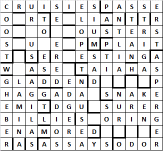 So after some deduction and guessing on crossing words, the empty spaces started to take shape. The ‘Aha!’ moment for me was realising that WASE needed two letters and could become WEASEL. (It might also have helped if I had noticed the asymmetry of the grid, and focused on the areas with multiple bars…which may have got some of you there quicker?)