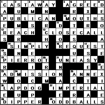 I hadn’t done one of these before, and enjoyed the challenge. I was slowed down by initially having “outcast” instead of CASTAWAY for the crucial first across clue.