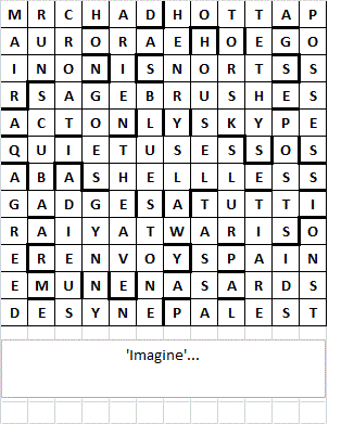 And then the penny dropped – there in the centre you have ‘us’, with ‘hell’ below ‘us’, and above us ‘only sky’ – and the rest fell into place, and out of the grid! The theme is John Lennon’s Utopian imagining of a world with no heaven or hell, no posessions, no greed or hunger, no countries, and no religion too…(although I would have thought of ‘voodoo’ and ‘Scientology’ as cults rather than religions, but maybe best not to go there!…)