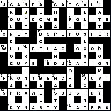 This was completed over two sessions.  One on the train where half fell in during a 20 min commute home.  On the second session rest I generally found what was left to do easier because I was helped by the crossing letters and more particularly I wasn’t so damn tired!   That is, except for the last couple, 16/18 and 14.  I found these two  tricky for different reasons.  For 16/18 I found it difficult to see the definition – even with the “?” it is not obvious – I thought “the police” must be part of the wordplay somehow, and “guys” in the sense of ridicule is not is tricky to see.  And for 14  I thought first word must be “The” or maybe “Two”.