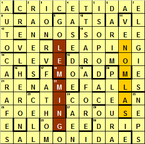 The bottom half of the grid yielded pretty quickly, and row 8 was ARCTIC OCEAN, the location, and row 11 was SALMONIDAE – one of the families. So migrating animals were the theme. The obvious thing that salmon do is jump over the falls on their way to spawn, where they are “Caught in the Act” by bears. Row 7 contained unclued FALLS, and a bit later when the top half began to yield, row 4 showed as OVERLEAPING , the technique, and row 1 as CRICETIDAE, the family of rodents which includes hamsters. The only leaping rodents to my knowledge are LEMMINGs which (reputedly) leap over cliffs and row 5 contained C?E?E which I interpreted as CLEVE a cliff.