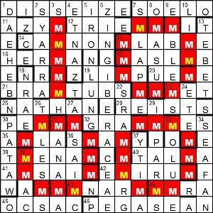 I must admit that I didn’t notice lots of Ms as I was solving the early part of the puzzle, but when two clashes each resulted in an M, it seemed possible that all the clashes would. I held off from trying to work out what the pattern generated by all these Ms was… perhaps a couple of large Ms. The correct letters in the misprints eventually spelt out Every em, which wasn’t surprising.