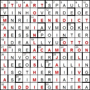 A lot of the acrosses were solved on my first run through the clues, but I didn’t have enough misprints to see any well-known phrase. The down clues weren’t quite as forthcoming, but all in all, I was happy with my progress after about an hour.