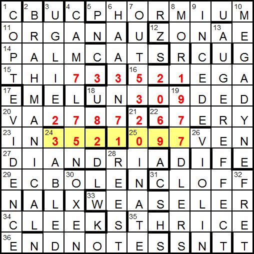 Here, four clues had wordplay indicating a letter of the answer in accordance with a quotation by TRRNRUN × VT. I wondered how that would be different from standard wordplay like “head of lettuce”. Four words would appear in the completed grid to form a representation of this quotation. These would need to be converted using a code in which ten letters are transformed into the digits 0–9.