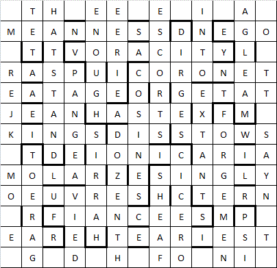 I am grateful again to my test-solvers Artix, Chalicea and Shark, all of whom helped to tidy up the clues, and of course to the EV editor Samuel for accepting this. The printing error was unfortunate and a bit annoying but out of all our control. I hope it didn’t discourage too many solvers from attempting the puzzle.