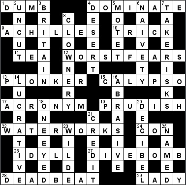 | 28 | DEADBEAT | Idle bum needs stiff whip (8) DEAD (stiff) BEAT (whip) |