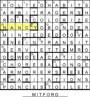 All that remained was to change NANCE at 12ac to NANCY and write MITFORD under the grid. I almost felt sorry for anyone who hadn’t heard of all this U and non-U talk before as I suspect it might have made the endgame somewhat difficult!