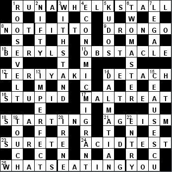 24 | ACID TEST | Crucial assessment dictates outcome (4,4) (DICTATES)* AInd: outcome. One of the simpler “first pass” clues |