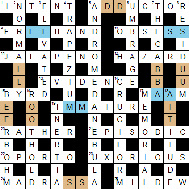 The grid is a little unusual having eight words with two adjacent unchecked letters. This made solving the puzzle difficult as even a half-filled grid left long stretches of empty cells.