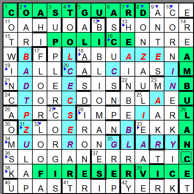 As with all the best puzzles, the interplay between the clues and the theme built right to the end and gave nudges at just the right moments. Spotting FIRE SERVICE dispelled any lingering Ghostbuster thoughts and gave some much-needed extra letters from COAST GUARD and AMBULANCE.