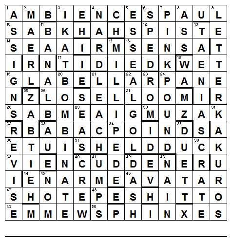 I solved the 1A anagram immediately with trepidation. An easy 1A ususally means a difficult puzzle, and this was no exception. There were quite a lot of unusual words e.g. SPAUL, SABKHAHS, GLABELLAR, to mention but a few across ones, and a number where there was more than one spelling available. The one which caused me the most trouble (which should have been the easiest) was PANE at 24A which had four alternatives to its normal spelling of PEEN. It took some time before I spotted it hidden in JaPANEse, after learning more than I wanted to know about Japanese character sets!