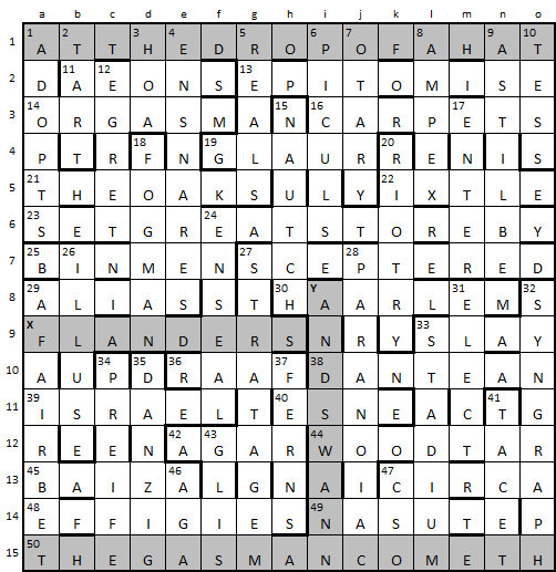 Most clues fell reasonably easy though, of course, I didn’t understand the consideration of 1 across at first. The first clue I solved whose wordplay didn’t seem to fit the grid was 33d looking like BONNET (a hat) needed to be removed. By this stage I had a fair bit of the back end of 1 across filled so I took a chance on it being AT THE DROP OF A HAT, which it turned out to be. As the grid fill continued, I had the makings of MAN COMETH at the end of 50 across. I’ve heard of The Iceman Cometh by Eugene O’Neill so I had a brief try at fitting him into X Y but that turned out to be a no go.
