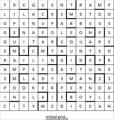 And, luckily for me, there was a quite early PDM, when I had FLOGGER, RIPE, QANAT and EXPORT going down in the top left corner, and worked out that (7,5) must be a ‘dancing’ QUEEN to make FREQUENT. So, we are at the earlier (earliest?) end of that spectrum…the ouevre of 70’s/80’s supergroup, ABBA…