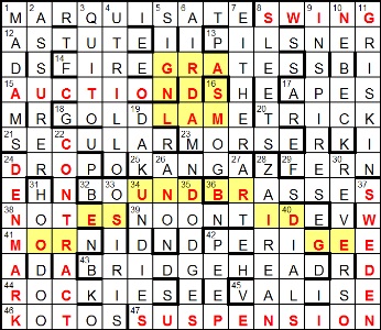 The clues weren’t too difficult, and it wasn’t long before SWING and SUSPENSION were revealed to me, followed by CONTRACT and AUCTION. All were types of bridge, the first two were the dangly, connecting things, the other two being major forms of the card game. There were thirteen 20s that needed to be removed from clues before solving, and they were all words for TRICK (at 20ac), and thirteen tricks would be a GRAND SLAM if bid and made at bridge.