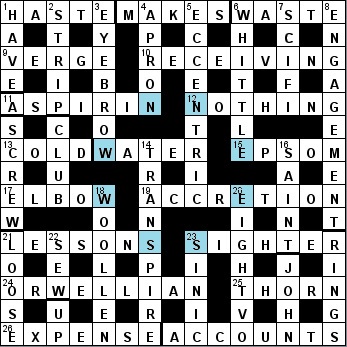 I’m not one to casually pepper clues with ticks (I have often gone days without marking a single clue thuswise) yet I see I ticked COLD WATER, EPSOM, ORWELLIAN, THORN, STRIP CLUB, EYEBROW and WOOLLENS. And two ticks for SCIFI!! Maybe I was just in a good mood, but I came here specifically to offer my heartfelt thanks to Monk – I thoroughly enjoyed it.