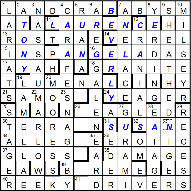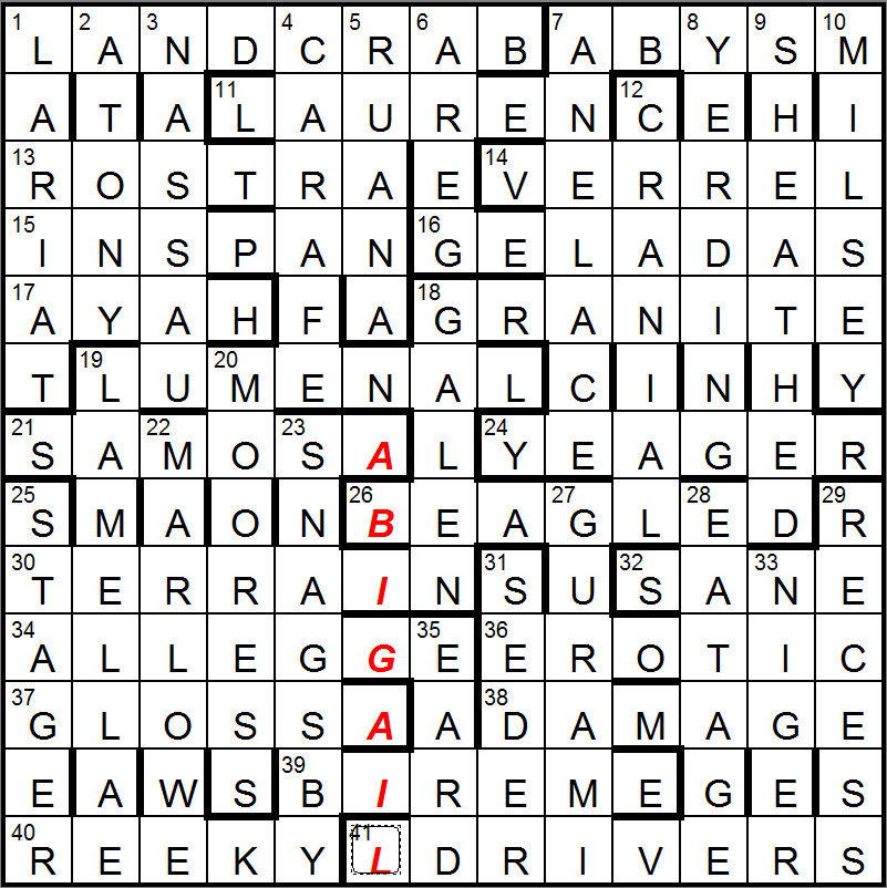 Once ABIGAIL is removed, ignoring spaces, we have new words,at 21 across (SAMOS), 26 across (EAGLED), 30 across (TERRAN), 34 across (ALLEGE), 37 across (GLOSS), 39 across (BREME) and 41 across (DRIVERS), all of which can be found in Chambers.