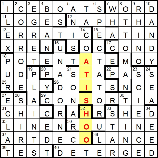 EV 1185Here we had a sequence of consecutive letters (nine words and two abbreviations) that needed to be removed from eleven answers. The remaining entries were defined in a sentence in the preamble: The head (smart) knew an action to pierce boxes; to express pleasure to count; to check an obsession to express verbally. These eleven, and one more that required highlighting in the final grid, were principal roles in a famous oevre.