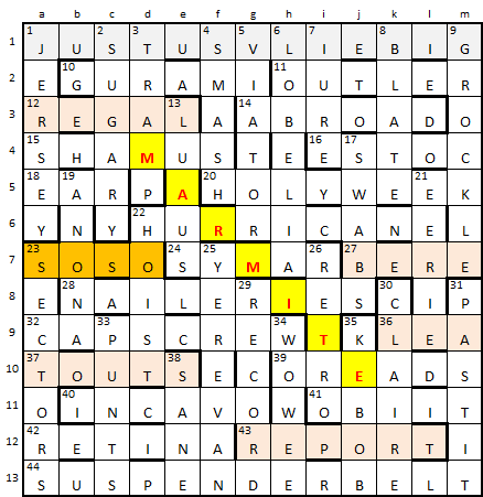 Nothing was jumping out at me so I left it overnight. Next day with fresh eyes I guessed that I should probably concentrate on a four-letter entry. There are only four and it didn’t take long to home in on 23a SO-SO, which can be changed to LOVE or HATE while changing 19d to ANANA 23d to LECTORS or HECTORS and 22 to HEIST.
