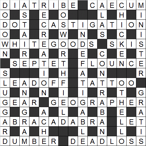 Yes, good standard for a Saturday with not many really easy ones. A few new words / terms such as DO DOWN and OTHELLO as a board game. It’s been a while since I’ve seen ‘GAT’ for a ‘piece’ and I spent too long going through all the chess pieces before I twigged. I liked ABRACADABRA, FLOUNCE, ANAGRAM and the ‘hidden’ Spoonerism of DEAD LOSS. No comparative necessary – I missed DUMBER, substituting that well known dye ‘IMMER’ instead.
