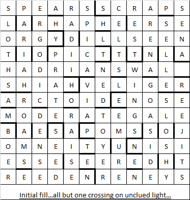 2. An accessible EV, after a couple of weeks staring at mostly empty grids. 🙂 The gradual appearance of Hadrian’s Wall helped clear up a few problems around the NW corner, and Google helped with the quotation. Finding the required bits in the grid after, though, I think took as long as the rest put together…
