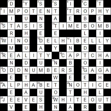 21. I got roughly the right-hand half of this without too much trouble, but the left-hand half defeated me. I always have severe difficulty with the Enigmatist. My least favorite type of clue is where you have to subtract stuff (either in general or before anagramming the rest), and a close second-least is what I’ll call the turducken type clue: Stuff A inside B, and put C around it. The grammar in those is usually so tortured that there are several possibilities about what goes inside what. The example here was DELHI BELLY, which took forever to figure out. Anyway, Enigmatist does a lot of both of those things.