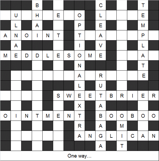 It was immediately clear that there were some clashes – EXCEL and TEMPLATE, OVERHAUL and ULNAE – and the simplest way to resolve them seemed to be to reverse one of the words…which fits with the preamble: ‘…one of two ways…’. I did this, and carried on doing so…and that was about it until I remembered I had to look for a message. Around the perimeter I gradually made out ‘BACK-TO-FRONT AND NORMAL’, which confirmed things, and helped get the last few entries sorted in terms of orientation: