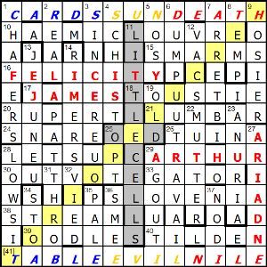 1. The PDM came pretty quickly for me in terms of the theme, although this was majorly helped by Mrs R who is a huge AG and HP fan. However, I made a bit of a mess of the end-game. It took me quite a while to realise what needed to be entered into the central grey column. A kick-oneself moment when it dawned. In addition, I am pretty sure I failed to spot HP in the NESW diagonal – warranting a kick to the other shin.