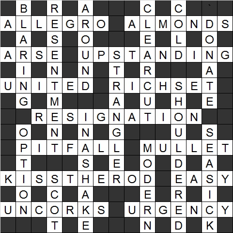 And surprisingly little smut, for a Cyclops – a ‘Phwoar’ at a Sun spread in 24A; a masochistic MP ‘kissing the rod’ in 23A and a male ‘peer’ giving it a shake, in 16D. Oh, and a ‘penis’ in the anagram for EASY OPTION! As you were then, maybe an average smut quotient after all!