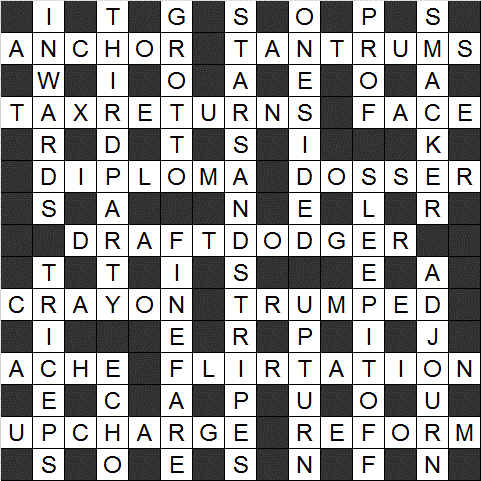 We have the STARS AND STRIPES ‘front-and-center’ at 4D, down the middle column, and references to (Bill) Clinton’s draft-dodging (15A), Trump’s TAX RETURNS (10A), some TRUMPED UP CHARGES at 20/25A, although they involve more than just 24A FLIRTATION…and then, the 9A TANTRUM(P)S.