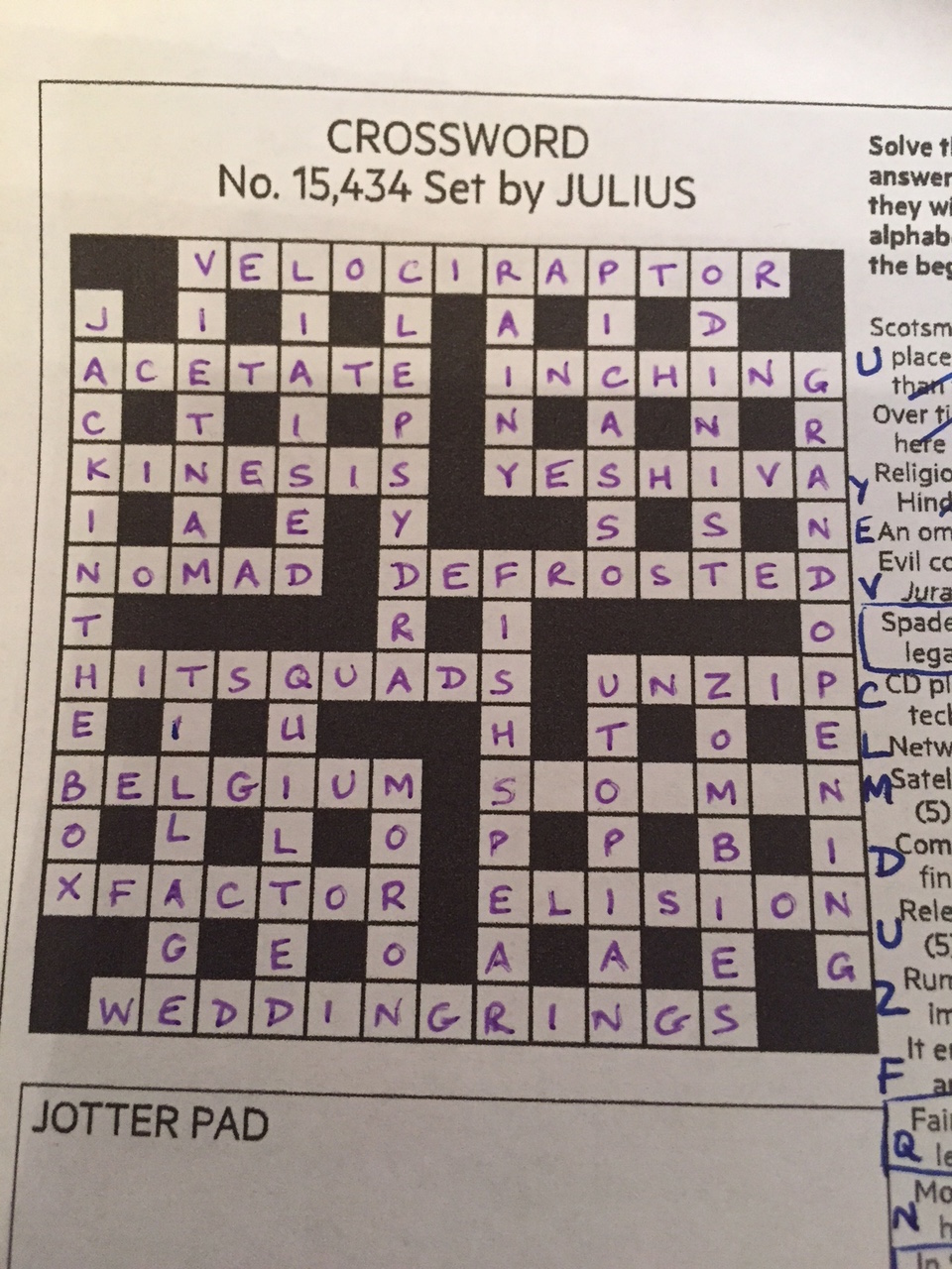 The FT grid library has only three grids in it in which the last across light is numbered 26 (a pre-requisite for an alphabetical jigsaw) and all these have quite long perimeter lights. Therefore, it seemed much too easy to list the clues in the usual way since, by entering VELOCIRAPTOR and JACK-IN-THE-BOX, the solver gets 13 of the 26 starts.