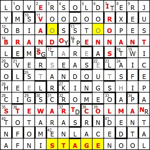 I enjoyed this and was lucky enough to pick up on the theme without too much gnashing of teeth, with memories of the BBC’s 400th anniversary Shakespeare celebrations still fresh in the mind. I was in two minds whether to highlight or remove the items, and ended up removing as per Dave, thus taking ‘sans’ literally. I’d never heard of Ronald Colman until reading the blog, I was thinking Olivia!