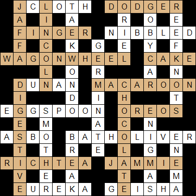 Eventually cracked the theme after getting BATH OLIVER and WAGON WHEEL. There were many of the biscuits that were new to me including JAMMIE DODGER, DIGESTIVE, RICH TEA and JAFFA CAKE. There were a number of other new terms as well – J-CLOTH, JAMMY (meaning lucky) and DODGER (as a shield from bad weather).