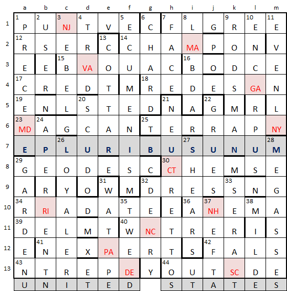 I thought this was a most amazing grid construction. How eXtent had got the motto, the “dropped” letters to form U.S AND the 13 clashes to form the state abbreviations was quite stunning.