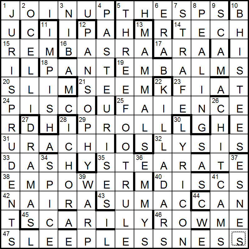 I was initially dismayed by the now all-too-common “extra letters to elucidate endgame” requirement, but clues were amenable enough to reveal, fairly quickly, what seemed to be required. Unfortunately I didn’t bother to parse the obvious entry for 29a and thought the message was VILLAGE PEOPLE … FIT LETTERS, and thus spent ages looking for contiguous sequences of the group’s surnames. Then I looked at the title and remembered young friends who had often stayed at a “Y” on their travels, and pennY dropped.